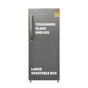Candy’s 190-liter single door refrigerator features toughened glass shelves and a large vegetable box for efficient storage. The metallic brushline silver finish adds a premium look. With a 5-star energy rating, it ensures lower electricity bills without compromising on performance.